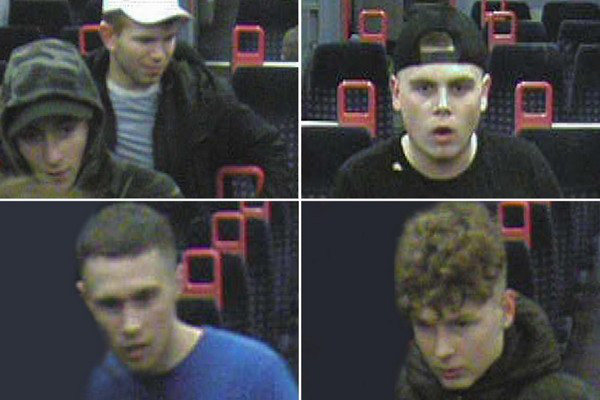 La police des transports britanniques a publié des images fixes de vidéosurveillance de cinq personnes soupçonnés d’être responsable de cette attaque homophobe et a lancé un appel à témoins .