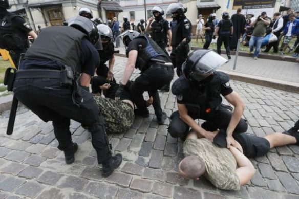 Plus de 150 membres d’organisations nationalistes s’étaient réunis à l’aube pour bloquer le défilé qui doit parcourir les rues de Kiev.