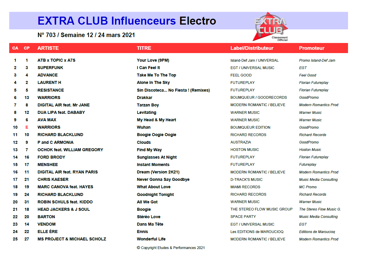 Extra Club – classement officiel des titres « clubs » préférés des DJ’s et radios en France à retrouver chaque samedi à 19h00 et animé par Laurent Veix.