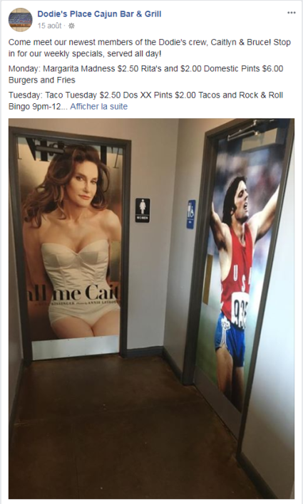 Dodie’s Place Cajun Bar & Grill, un restaurant d’Allen, en banlieue de Dallas (Texas) a soulevé une vague d’indignation en utilisant des images de la star transgenre, avant et après sa transition, pour indiquer à quel genre s’adressent ses différents sanitaires.