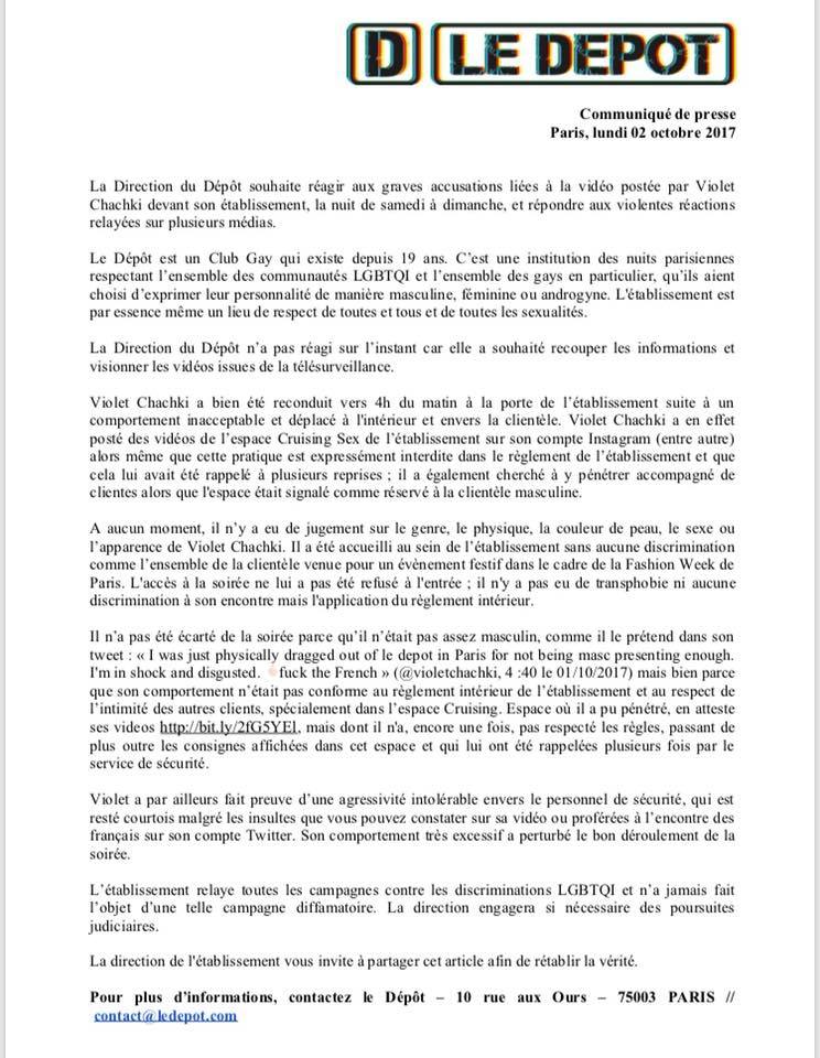 Le Depot à publié une réponse à cette attaque de la starlette du concours télévisé américain de drag queens « RuPaul’s Drag Race ». Nous avons décidés de ne pas résumer mais de simplement diffuser le communiqué de presse de l’établissement parisien.